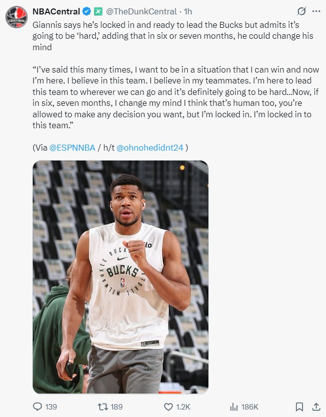 北京时间10月9日,美国媒体NBA Central转发了扬尼斯接受ESPN专访的片段,字母哥在采访中回应了交易流言的一些细节,我目前专注于雄鹿,如果6-7个月后我改变主意也是人之常情。